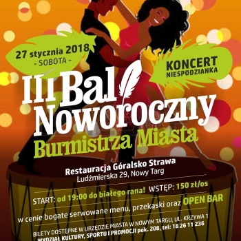 Burmistrz Miasta Nowy Targ oraz Fundacja im. Adama Worwy zapraszają na III BAL NOWOROCZNY BURMISTRZA MIASTA który odbędzie się 27 stycznia 2018 r., w Restauracji Góralsko Strawa, ul. Ludźmierska w Nowym Targu. Start od godz.19:00 do białego rana! Wstęp 150 zł/ os.