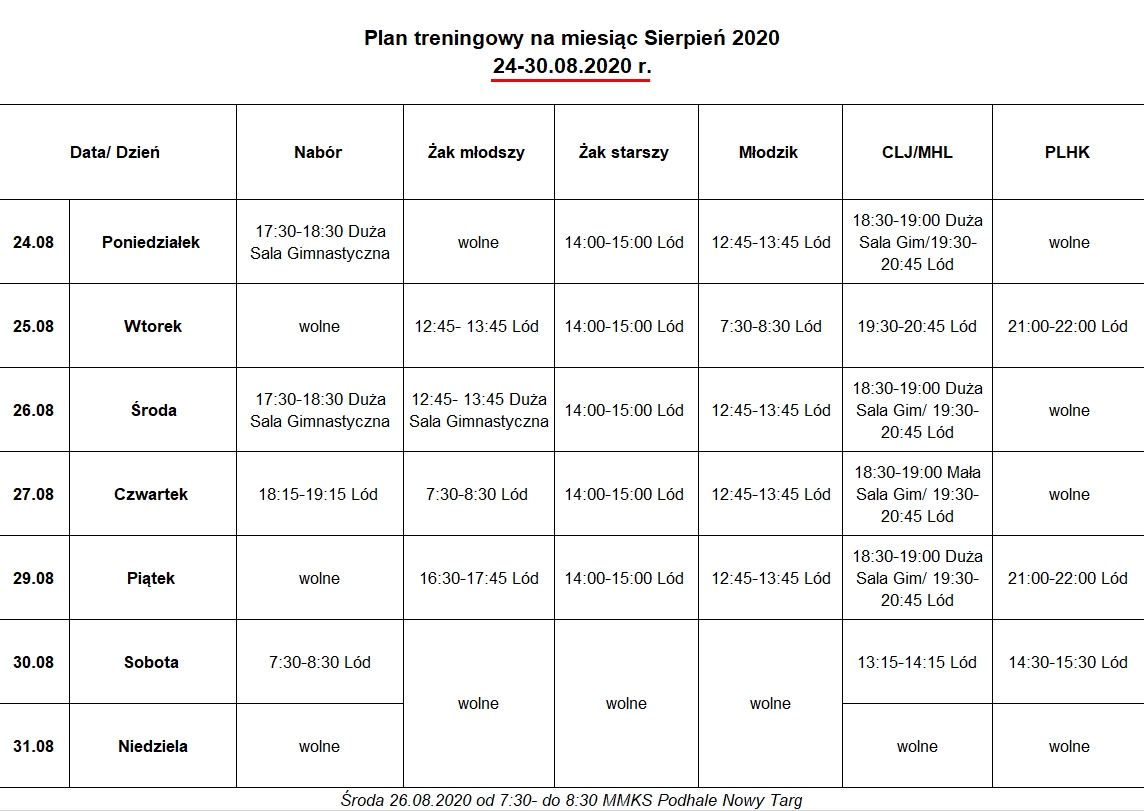 Przedstawiamy aktualny harmonogram treningów w MMKS Podhale Nowy Targ na okres 24-30.08.2020.Trenerzy przypisani do grup na miesiąc sierpień 2020: