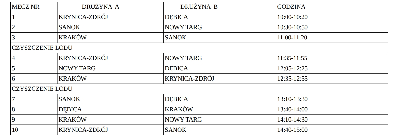 W wydarzeniu wystąpi 5 zespołów. Poza "Szarotkami" także Krynica, Sanok, Kraków i Dębica. Mecze będą rozgrywane z podziałem na grupy A i B i będą toczyć się równocześnie na dwóch taflach.Pierwszy mecz nasi zagrają z Sanokiem. Dokładnie o godzinie 10:30! Poniżej prezentujemy pełny harmonogram turnieju, a naszym małym graczom życzymy powodzenia i dobrej zabawy!