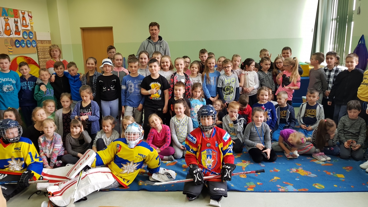 Celem wizyty była promocja hokeja i zachęta do aktywnego, sportowego spędzania czasu. Dzieci na wstępie zostały przepytane przez trenera i bardzo mu zaimponowały dużą wiedzą o zawodnikach z naszego klubu, wychowankach jak i na temat zasad gry w hokeja. W końcu wyszło na jaw, że uczniem szkoły podstawowej był Damian Kapica. Drugim dobrze rozpoznawalnym zawodnikiem, któremu w szkole kibicują, jest nasz wychowanek Bartłomiej Neupauer, wujek jednego z uczniów, na którego przymierzony sprzęt hokejowy bardzo dobrze leżał. Kandydat na zawodnika w sprzęcie hokejowym prezentował się wyśmienicie i nie tylko on jeden. Dzieci do przymierzenia stroju hokeisty jak i bramkarza bardzo się garnęły.Wygląda na to że nasz klub odwiedzą na treningach dzieciaki z Waksmunda ? Na wszelki wypadek przygotowujemy w klubie do wypożyczenia dla kadetów naboru nowy sprzęt hokejowy !