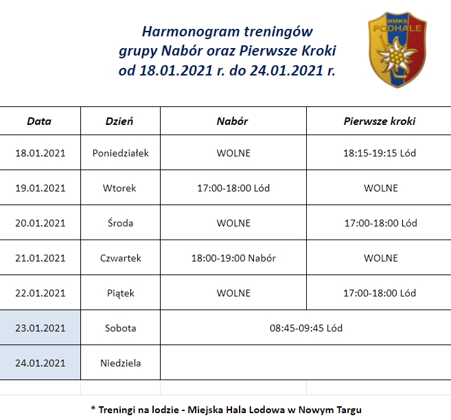 Poniżej prezentujemy harmonogram treningowy dla dzieci z grupy Naboru oraz uczestniczących w zajęciach Pierwszych Kroków. Harmonogram przewidziany jest na okres od 18.1.2021 r. do 24.01.20201.