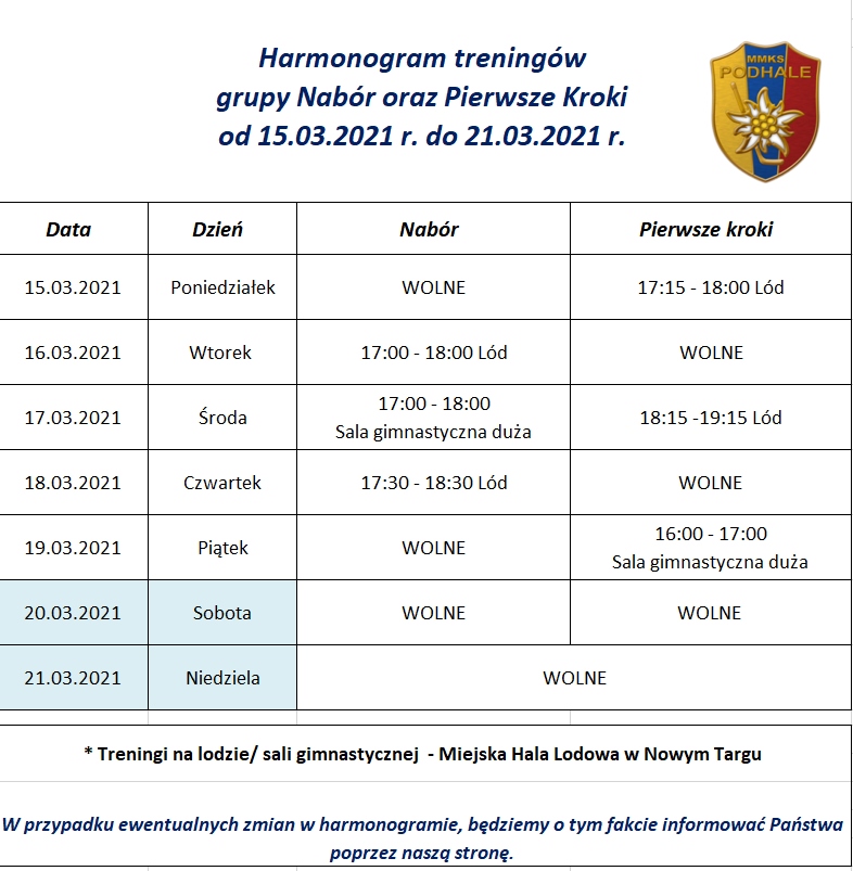 Poniżej prezentujemy harmonogram treningowy dla dzieci z grupy Naboru oraz uczestniczących w zajęciach Pierwszych Kroków. Harmonogram przewidziany jest na okres od 15.3.2021 r. do 21.03.2021.